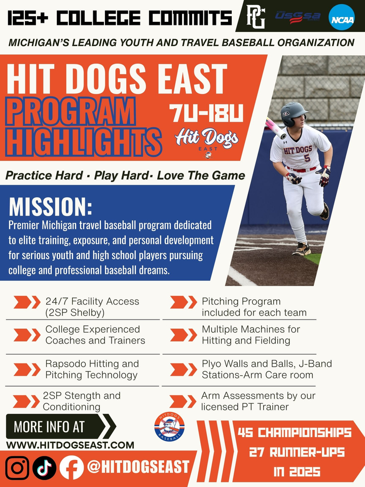 Hit Dogs East continues to set the standard for elite youth and travel baseball in Michigan. With 125+ college commits, our program is built for players ages 7U–18U who are serious about development, competition, and exposure at the next level.